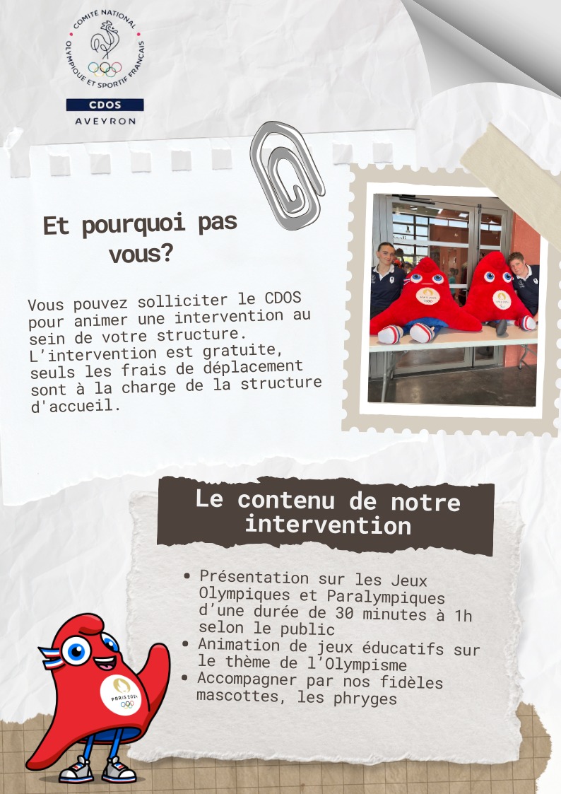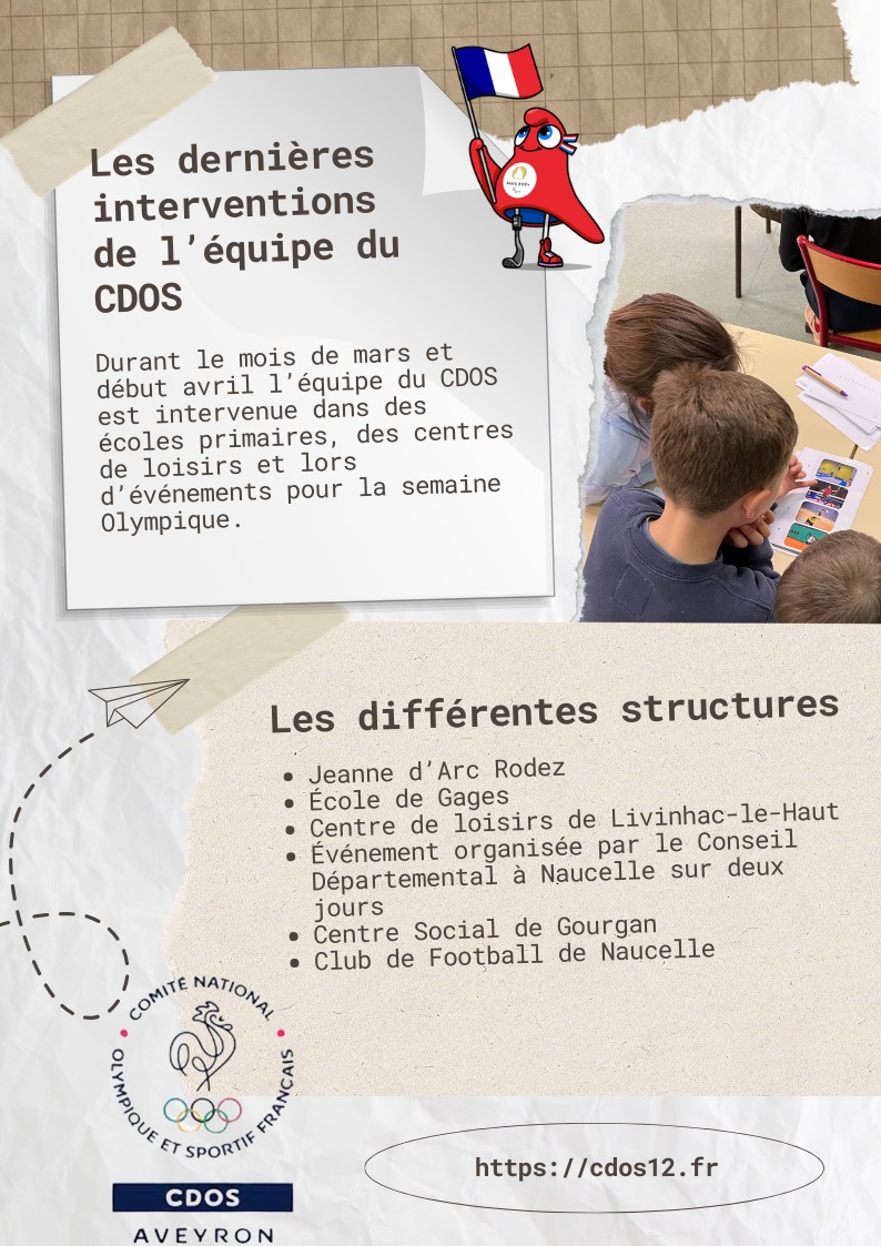 En collaboration avec la DSDEN et pour participer à l’animation du réseau Génération 2024, le groupe départemental des CPC-EPS et le CDOS ont mis en oeuvre depuis 2023 un projet appelé l’Aveyron s’enflamme : il s’agit de faire le tour des écoles du département avec une malle olympique (physique et virtuelle) afin de récolter les différents travaux réalisés autour de l’Olympisme. Le point final de ce projet étant l’organisation pour les écoles participantes d’une journée Olympique scolaire les 20 et 21 juin à Espalion avec une rencontre de handball sur herbe, des initiations sportives (lutte, tennis de table, judo), un atelier de prévention des violences, un atelier sur l’Olympisme, rencontre avec des sportifs de haut niveau (lutte et judo) et la présentation des travaux de la malle.