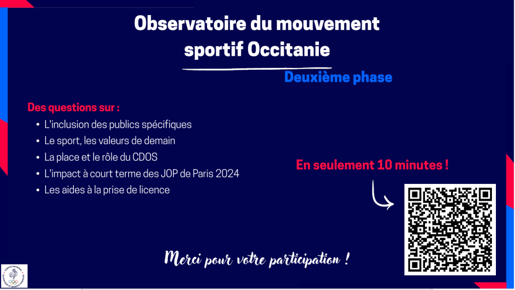 L’observatoire du mouvement sportif Occitanie est en 2025 dans sa 2ème phase. Clubs, comités départementaux Aveyronnais nous vous remercions de prendre quelques minutes pour compléter le formulaire avec la QR Code suivant.