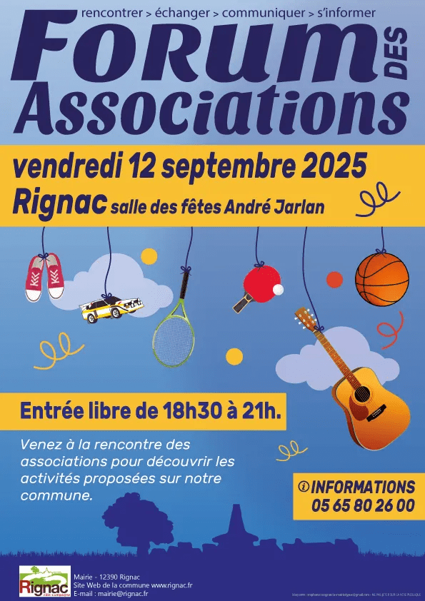 Le Vendredi 12 Septembre est ouvert un forum des associations à la salle des fête Endré Jarlan à Rignac de 18h30h à 21h. Ce seras l’occasion de venir à la rencontre des associations pour découvrir les activités proposées par chaque association de la commune.