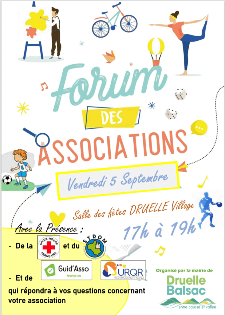 Le Vendredi 5 Septembre, les associations locales de la ville de Druelle Balsac se réunissent lors de son forum des associations de 17h à 19h a la salle des fête Druelle village, l’occasion pour tous les participants de découvrir de nouvelles activités.