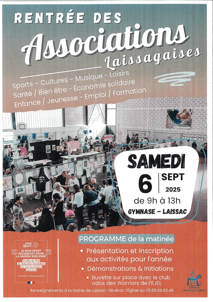 Le Samedi 6 Septembre aura lieu la rentrée des associations Laissagaises au gymnase de Laissac de 9h à 13h. Lors de cette matinée sont prévues :