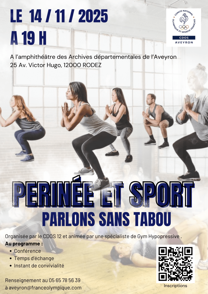Le 14 novembre 2025 se tiendra une conférence sur le thème « Périnée et Sport, Parlons sans tabou » organisée par le CDOS Aveyron.