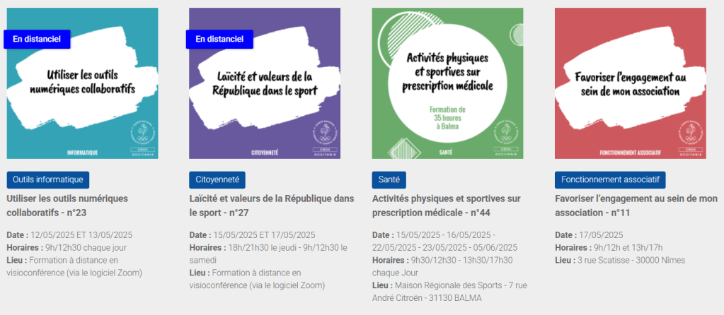 Le CROS Occitanie mène des actions de formation d’une à deux journées à destination des bénévoles dirigeants et salariés du mouvement sportif. Ces formations sur des thématiques telles que l’informatique, le sport-santé, les finances, la communication, le fonctionnement associatif peuvent se dérouler en présentiel ou en Visio-conférence.